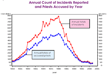 Nessa coluna trataremos dos 2 primeiros pontos. O estudo completo pode ser baixado do sítio: http://www.jjay.cuny.edu/churchstudy/main.asp A primeira pergunta de um epidemiologista é: qual o tamanho do problema? Nessa caso o tamanho do problema pode ser resumido respondendo a pergunta: quantos padres foram acusados de abuso sexual de menores, entre 1950 e 2002? O estudo chegou a conclusão que 4392 padres foram acusados de abuso sexual, e essas acusações não foram retiradas ou provadas falsas, entre 1950 e 2002. Utilizando o censo das dioceses americanas esse número indica que 4% dos padres ativos durante esse período foram acusados de abuso. A próxima pergunta do epidemiologista é: esse número configura uma epidemia? Uma epidemia é uma distribuição de casos acima do número esperado. Para tanto, precisamos ter uma expectativa como ponto de comparação. Uma das maneiras de fazer essa comparação é observar a distribuição de casos no decorrer do tempo. Baseado nessa distribuição o estudo concluio que houve um aumento gradual de alegações de abuso sexual a partir da segunda metada dos anos 60, com um pico em 1970, acompanhado de uma gradual redução a partir de então. O gráfico abaixo, parte do estudo original, apresenta a distribuição das acusações por ano.