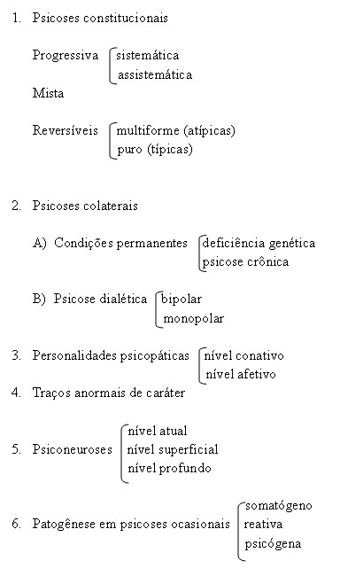 Esquizofrenia 10- Parafrenia 11- Paranóia 12- Óligofrenia propriamente dita (endógena) 13- Psicose mista. Quadro associado (ou enxertada) IV – CONDIÇÕES ENDÓGENAS MARGINAIS (POR DISPOSIÇÃO
